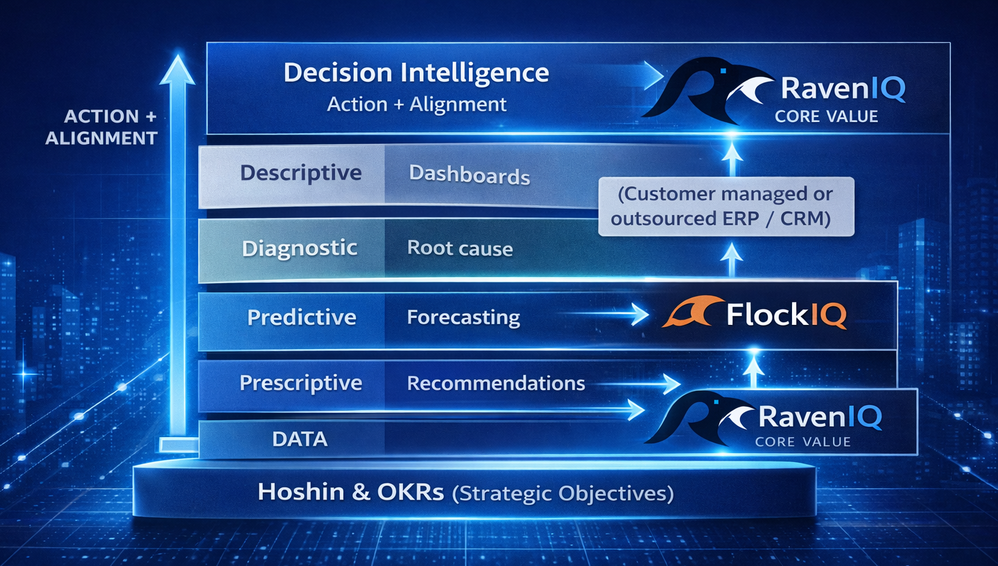 RavenIQ sits above traditional analytics platforms—transforming data into a real-time system of decision-making aligned to strategy.